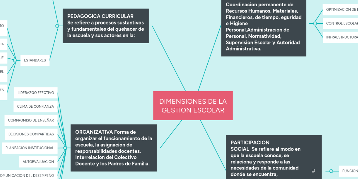 Mapa conceptual de las dimensiones de la gestion escolar. Con la finalidad de organizar y comprender mejor la información analizada se dejó de tarea la elaboración de un mapa conceptual. Mientras tanto la lectura guiada ayudó a los pupilos a develar el sentido del texto. Cualquier modelo es bueno solo que hay que determinar bien el objetivo o la finalidad que se tenga al momento de evaluar debido a que esto permitirá elegir el mejor modelo de acuerdo a las necesidades del evaluador si este desea evaluar solo los objetivos elegirá a Tyler o si se desea ver las contingencias y congruencias lo propuesto y lo. Su sede se encuentra en Madrid. El día martes la sesión se basó en la revisión de la tarea y en la explicación de las diferencias entre la estructura. BOE-A-2015-738 Orden ECD652015 de 21 de enero por la que se describen las relaciones entre las competencias los contenidos y los criterios de evaluación de la educación primaria la educación secundaria obligatoria y el bachillerato.